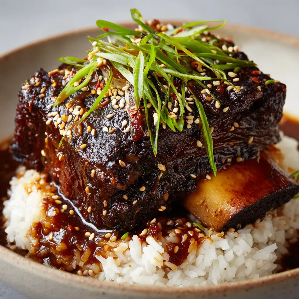 There is nothing quite as deeply satisfying as perfectly executed Asian Beef Short Ribs, slowly braised until the meat practically surrenders to your fork. This recipe captures the magic of a restaurant-quality meal right in your own kitchen, delivering massive bone-in beef short ribs coated in a dark, glossy, sticky caramelized soy glaze. When you set this masterpiece on the table, resting on a bed of fluffy white jasmine rice, the aroma of toasted sesame and rich soy will instantly fill the room.