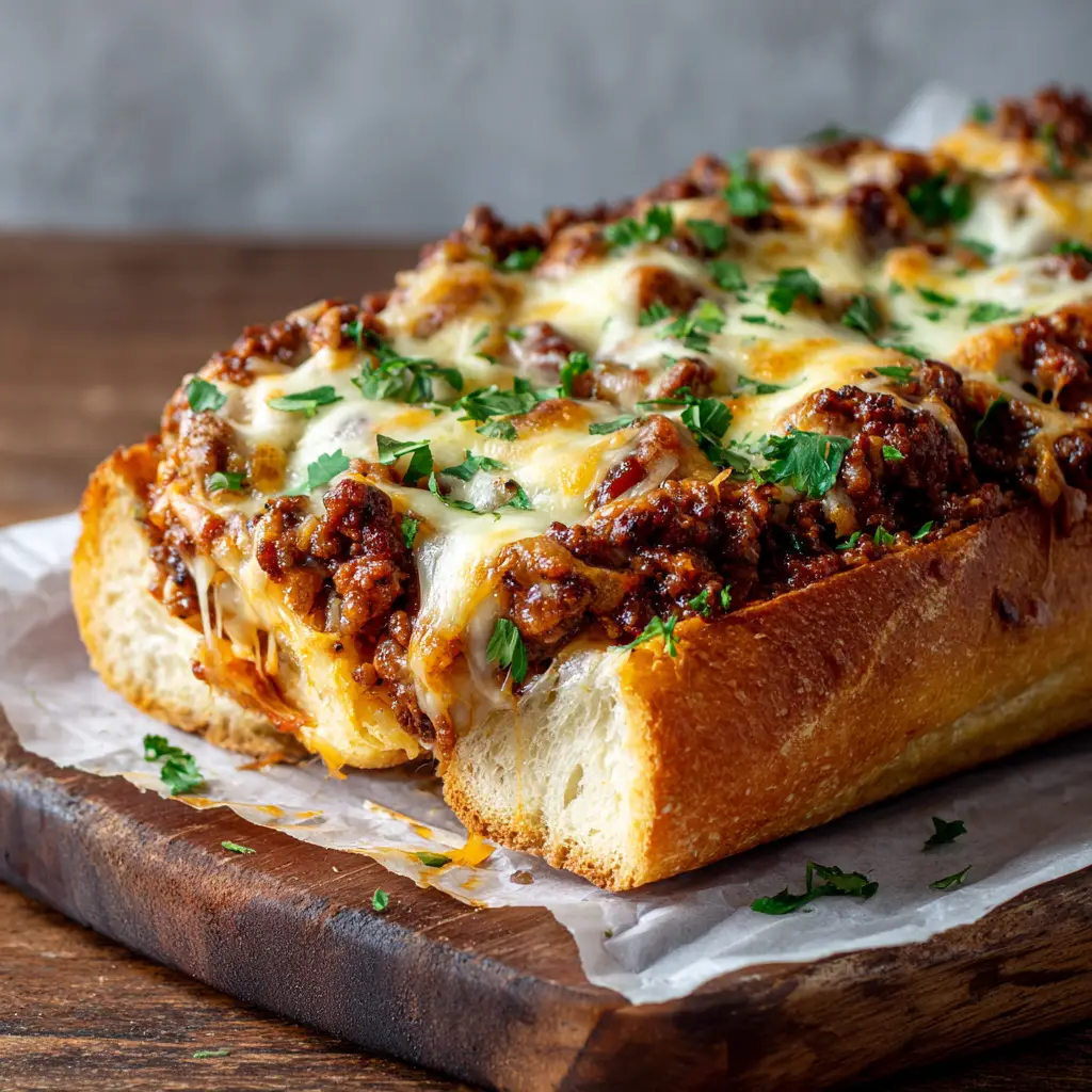 Once out of the oven, let the Cheesy Sloppy Joe Garlic Bread rest on the pan for just a minute. This allows the cheese to set slightly, making it easier to slice. Sprinkle the freshly chopped green parsley flakes over the top for that final touch of color and freshness. Place it on a rustic wooden cutting board, slice it into generous portions, and serve immediately while it’s hot and the cheese is at peak gooeyness.