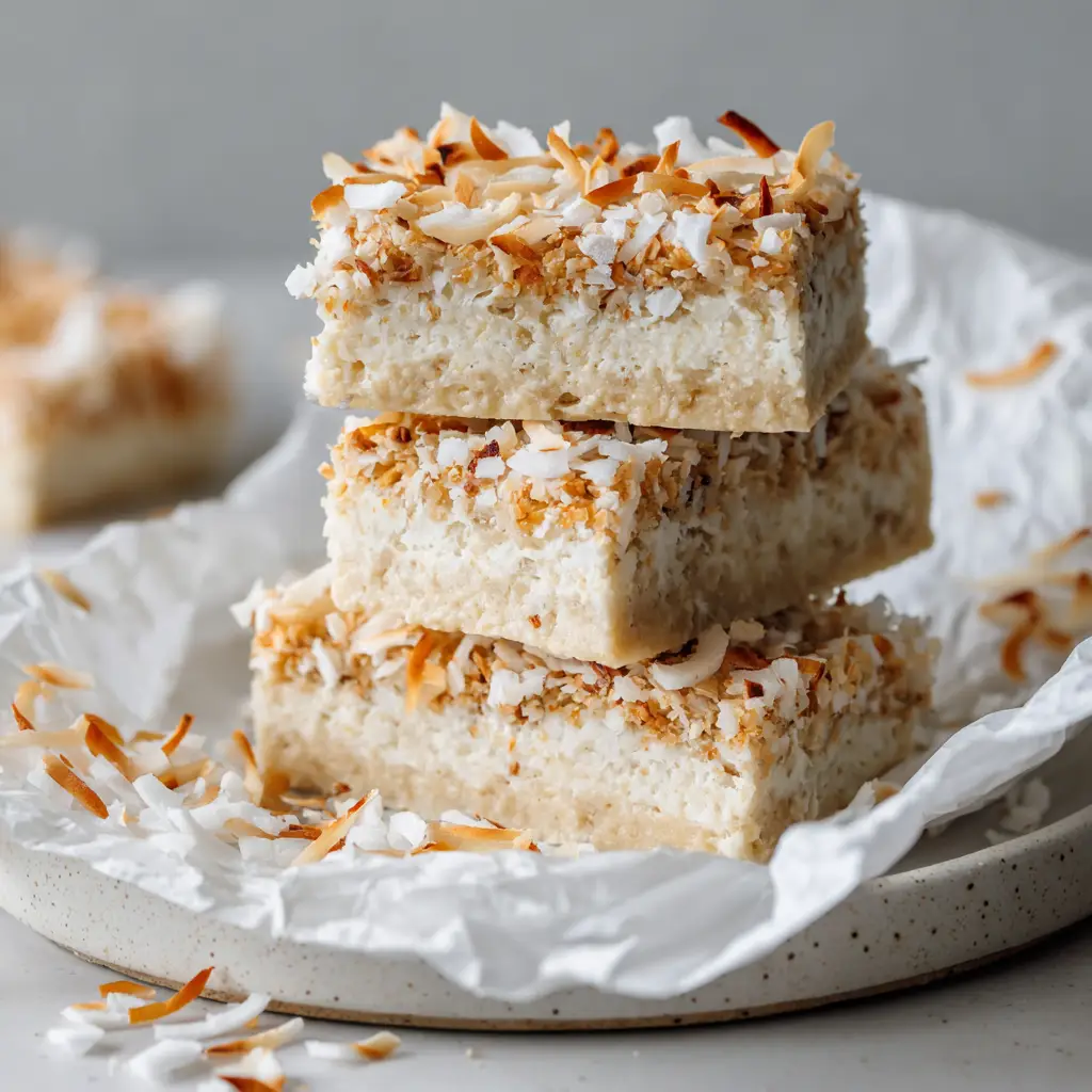 Discover the ultimate homemade Coconut Vanilla Protein Bars. This no-bake recipe features a dense, soft pale cream vanilla base mixed with fine white coconut shreds, topped with a thick layer of crispy, golden-brown toasted coconut flakes.