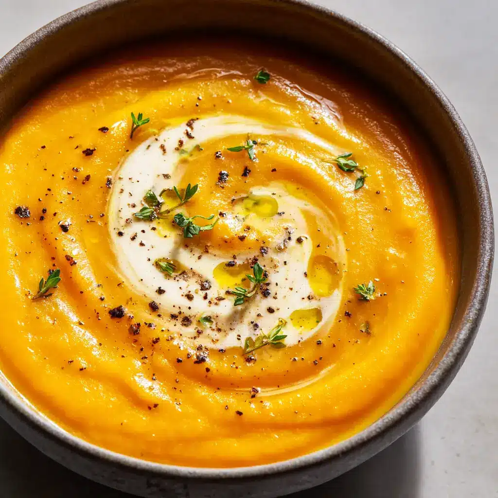 A thick, velvety Creamy Potato Carrot Soup featuring a golden-orange base of blended root vegetables. Elegantly garnished with a swirl of heavy cream, olive oil drops, cracked black pepper, and fresh thyme leaves.