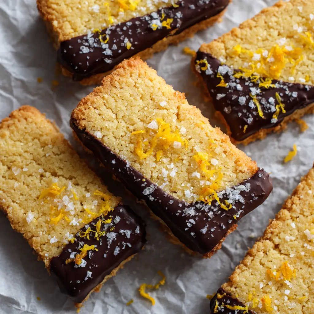 Crisp, buttery shortbread cookies infused with fresh orange, dipped in dark chocolate, and finished with a sprinkle of flaky sea salt. The perfect elegant treat!