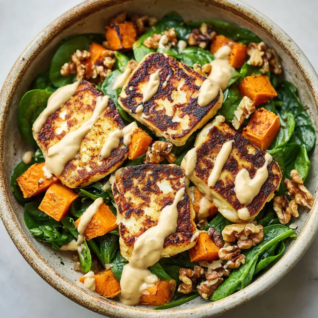 We’re moving beyond bland salads and into a world of satisfying textures and deeply roasted flavors. Imagine a bed of fresh baby spinach, topped with bright orange, charred sweet potato cubes, thick slices of golden-brown halloumi with a crispy crust, and the crunch of toasted walnuts. It’s all brought together with a generous, creamy tahini drizzle that you’ll want to put on everything.