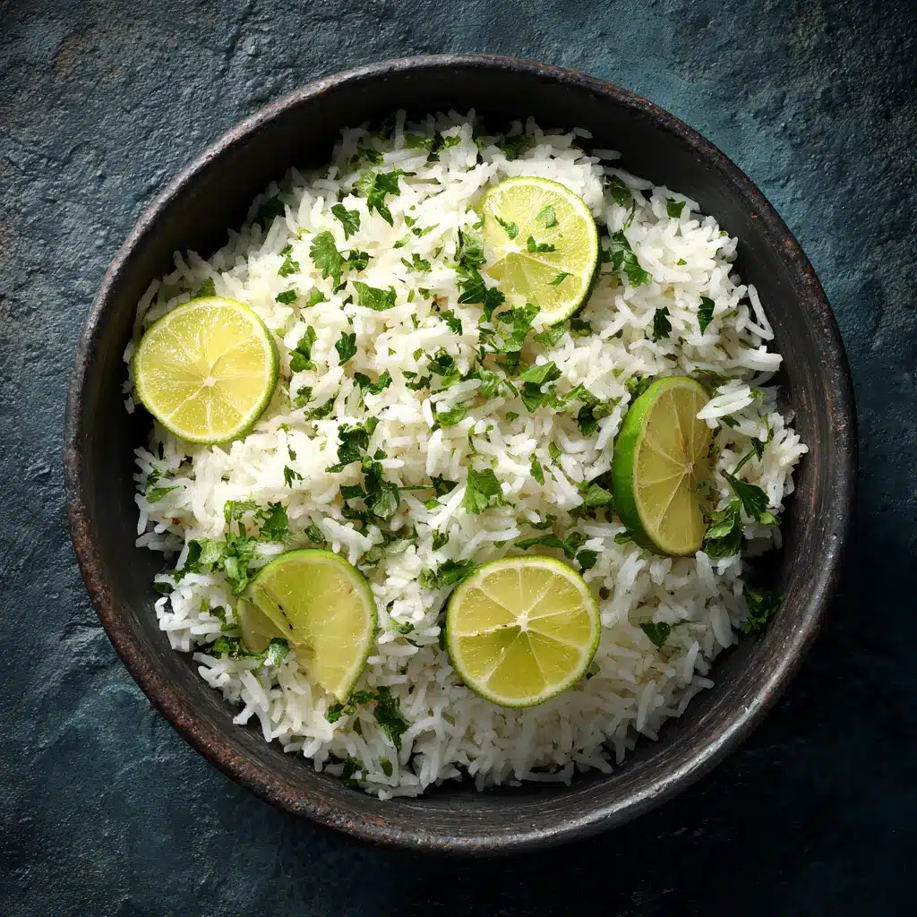 An overhead close-up shot of fluffy basmati rice with lemon and herbs in a rustic bowl, showcasing the perfect texture of the dish.