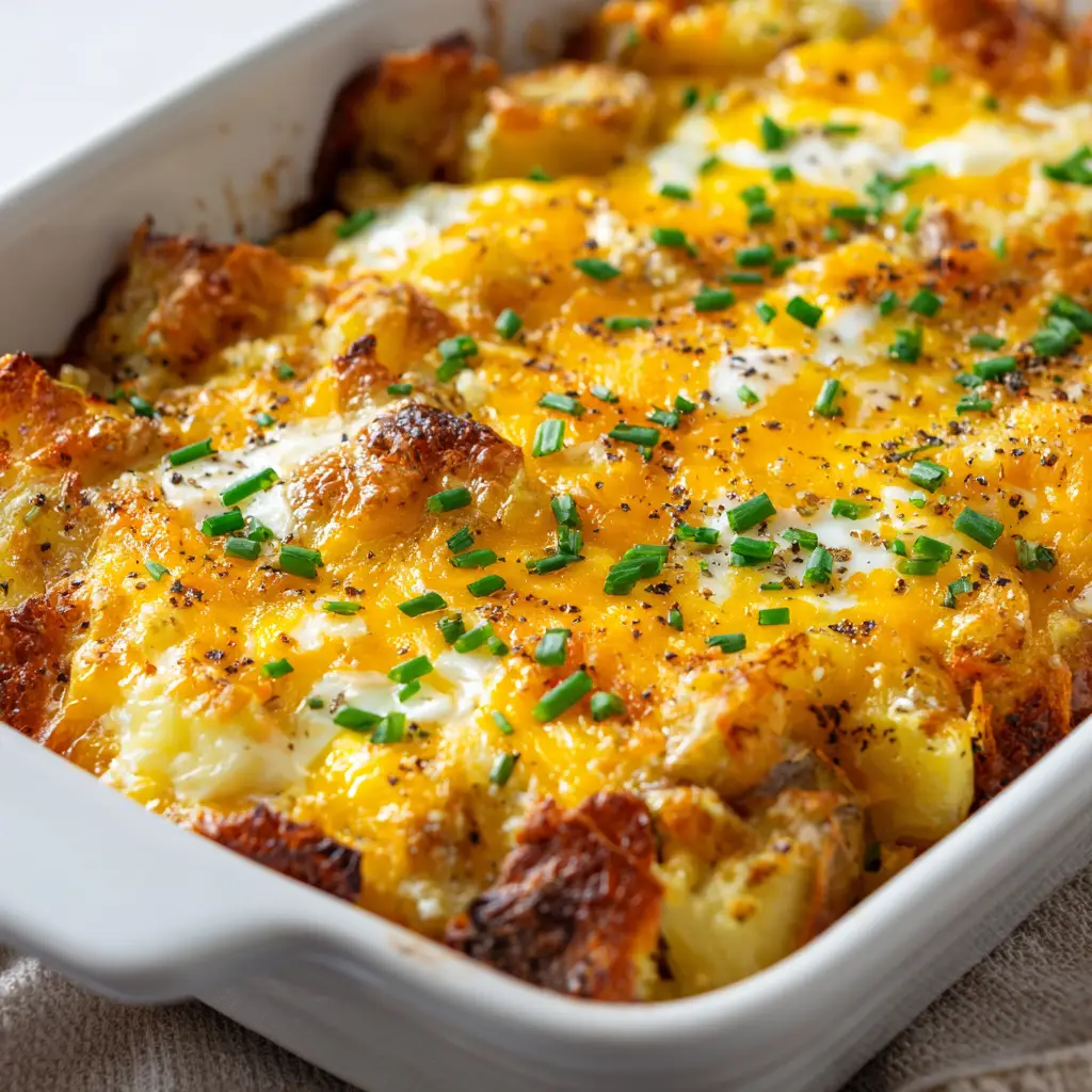 Golden Potato Breakfast Casserole with Crispy Cheddar Edges