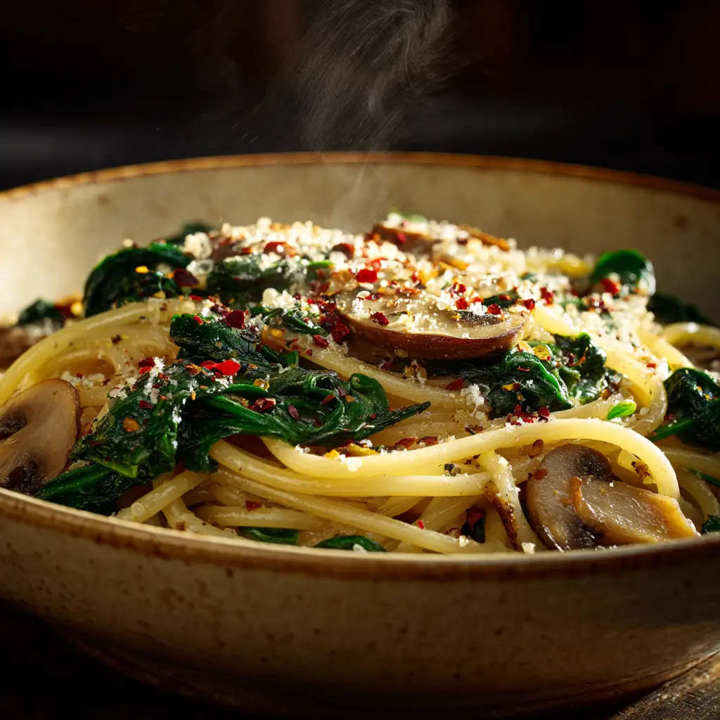 Reduce the heat to low and stir in the grated Parmesan cheese until it’s completely melted and the sauce is smooth. Season with salt, pepper, and red pepper flakes. Add the cooked mushrooms and fresh spinach to the sauce, stirring until the spinach has wilted. Finally, add the drained pasta to the skillet, tossing everything together until the pasta is well-coated in the creamy sauce. If the sauce is too thick, add a splash of the reserved pasta water until it reaches your desired consistency.