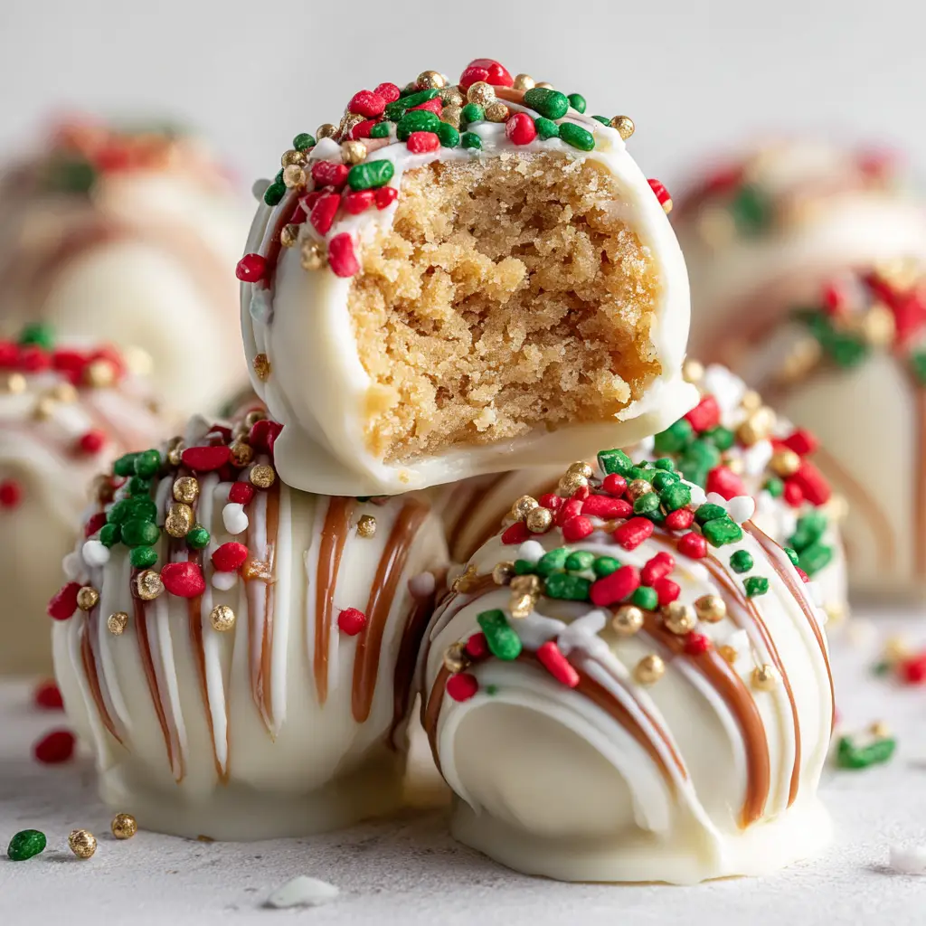 A close-up view of a stack of homemade sugar cookie truffles, highlighting their smooth white chocolate coating and festive sprinkles.